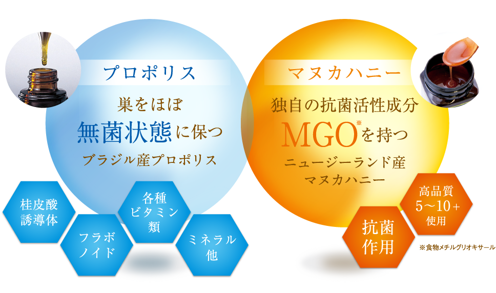 また、マヌカハニーとのブレンドのため弊社独自のエキス抽出を行い、配合しやすいプロポリス抽出物を添加、口当たり良く仕上げています。