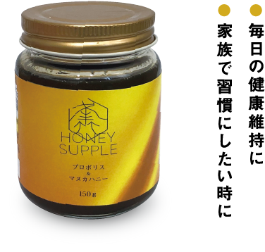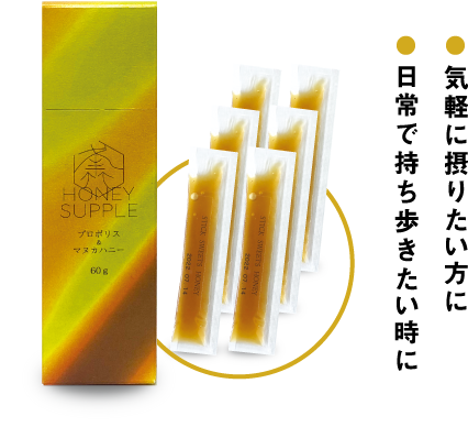 また、マヌカハニーとのブレンドのため弊社独自のエキス抽出を行い、配合しやすいプロポリス抽出物を添加、口当たり良く仕上げています。